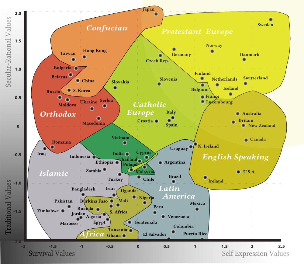 Микола Скиба говорив про роль навичок креативності в інноваційних процесах. Найбільш цікавим був слайд, який демонстрував цінності раціональності vs само-вираження. Як видно на рис нижче, Україна знаходиться в лівому сегменті «ортодоксальної» Європи, для якої характерні помірний раціоналізм та низький рівень само-вираження. На думку Миколи, ця позиція (культурні цінності) прямо впливають на стан економіки та рівень бідності. Бізнес в цій групі країн важче домовляється між собою, важче встановлює прогресивні закони й дотримується їх, в результаті всі прогресивні зміни – й на відміну від країни групу «Протестантська Європа», – йдуть повільніше й менш ефективно.